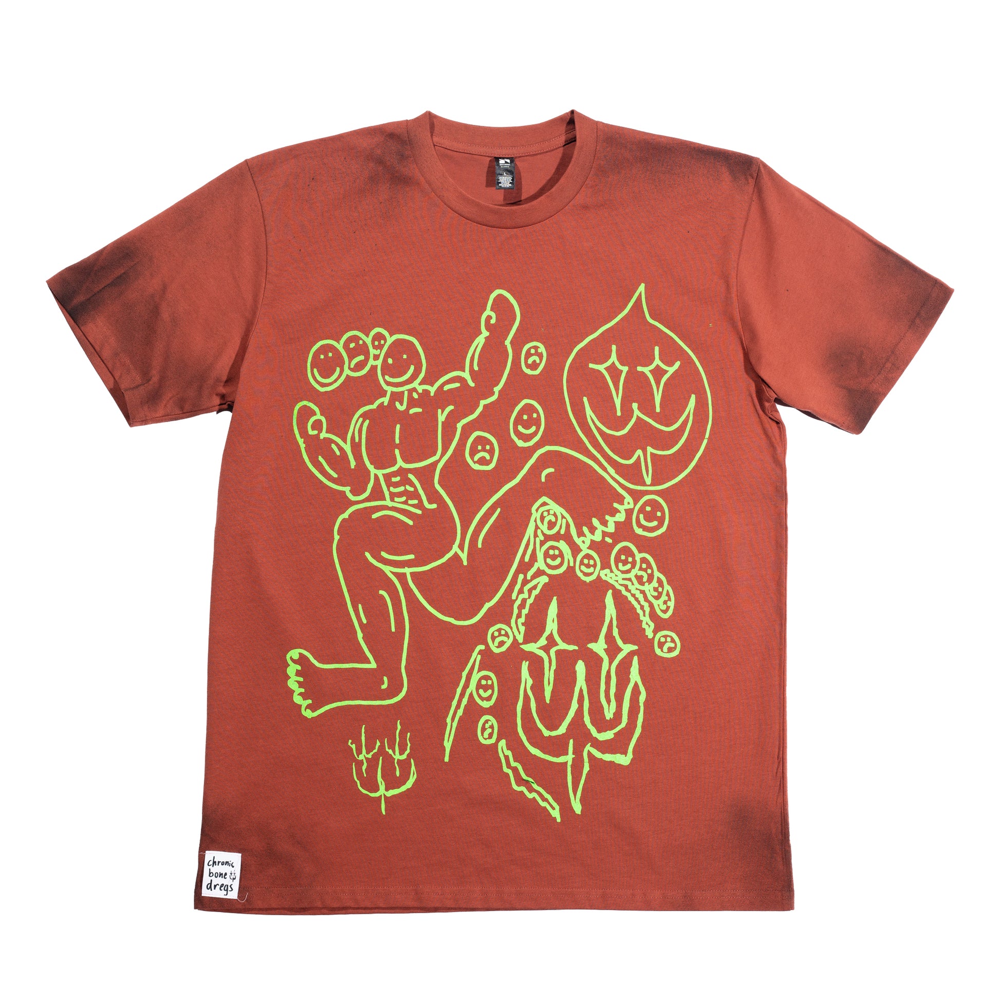 Every 'Chronic Bone Dregs' piece is sustainably sourced, second-hand clothing that has been carefully cleaned and revived with original artwork.
