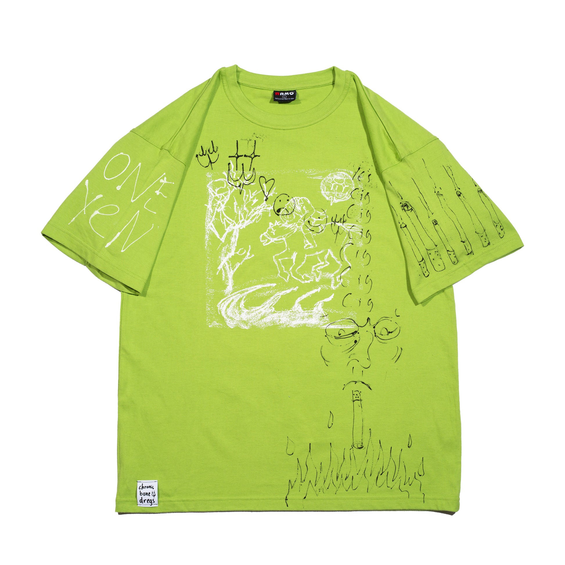 Every 'Chronic Bone Dregs' piece is sustainably sourced, second-hand clothing that has been carefully cleaned and revived with original artwork.